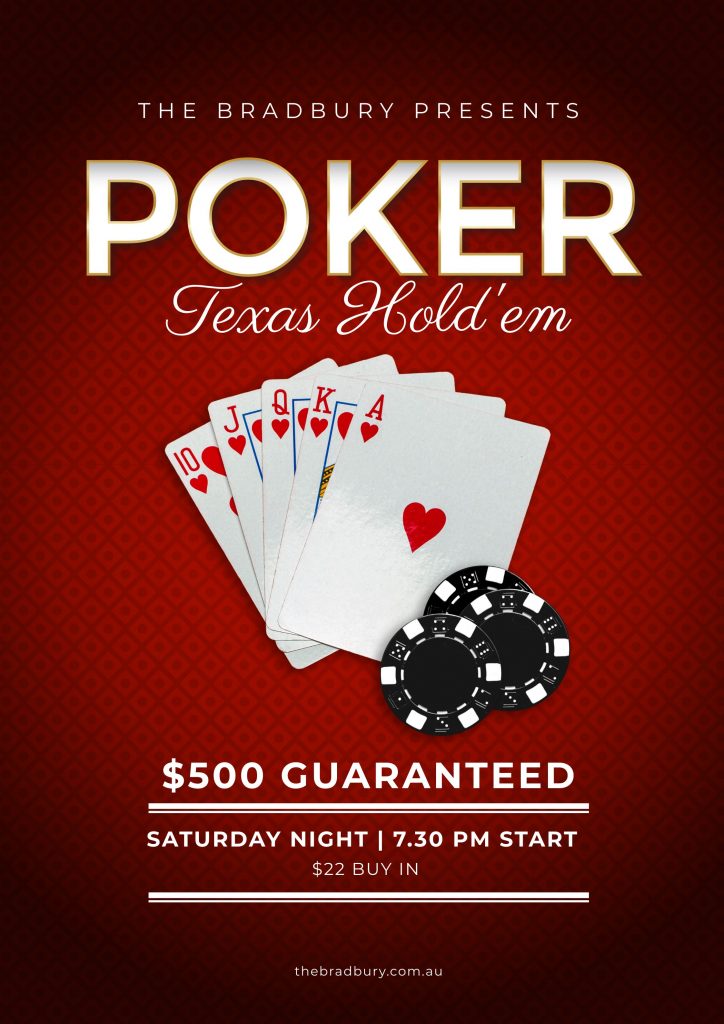 Saturday Poker Night Come and play Poker at The Bradbury. Every Saturday night from 7.30 pm. $500 Guaranteed! shelley2020-10-27T09:50:48+11:00 Related Posts $19 Surf n Turf $5 Tap Beers
